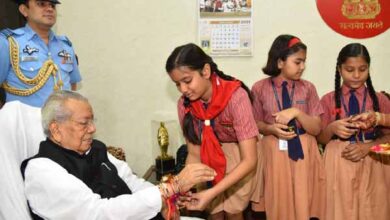 बाल ग्राम और स्कूल की बालिकाओं ने राज्यपाल हरिचंदन को बांधी राखी