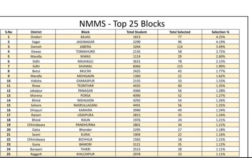 केंद्र सरकार की नीति के अनुसार मध्य प्रदेश शासन द्वारा भी आयोजित किया गया था जिसमें कक्षा 8 के बच्चों को टेस्ट देने का अवसर प्रदान किया गया था। कमजोर आर्थिक स्थिति के बच्चों का अध्यापन कार्य राशि के अभाव में बाधित ना हो, इस उद्देश्य को लेकर टेस्ट उत्तीर्ण करने वाले बच्चों को ₹12000 प्रति वर्ष दिए जाते हैं ।बड़े हर्ष का विषय है कि मंडला जिला इस मामले में मध्य प्रदेश में अग्रणी रहा तथा मध्य प्रदेश में नंबर पांच पर निवास विकास खंड जहॉ 29 बच्चे और नंबर 9 पर मोहगांव विकासखंड जहॉ 22 बच्चों ने परीक्षा उत्तीर्ण कर मंडला का नाम रौशन किया एवं अपने भविष्य को सुरक्षित किया इस संदर्भ में कलेक्टर मंडला डॉ सलोनी सिडाना एवं सीईओ श्री श्रेयांश कूमट का विशेष प्रोत्साहन योगदान रहा साथ ही जिला शिक्षा केंद्र के डीपी सी श्रीमती मुन्नी बरकड़े तथा ए पी सी डॉ. शेषमणि गौतम का भी विशिष्ट योगदान कहा जाएगा संबंधित विकासखंड के बी आर सी निवास श्री सुनील कुमार दुबे एवं मोहगांव विकासखंड में बी आर सी डॉ विनीत कुमार दुबे ने बच्चों को इस परीक्षा में सम्मिलित होने एवं स्कॉलरशिप प्राप्त कर अपनी पढ़ाई को निरंतर जारी रखने के उद्देश्य से टेस्ट में सम्मिलित होने प्रोत्साहित किया इससे मंडला नगर गौरवॉन्वित हुआ*। जिसमें निवास ब्लाक को पांचवां स्थान प्राप्त हुआ निवास टीम को विशेष बथाई एवं विशेष कर छात्र छात्राओं, एवं बी ई ओ, प्राचार्य, जनशिक्षक, एवं स्टॉप को जिनके नेतृत्व एवं प्रयास से यह मुकाम हासिल किया है।