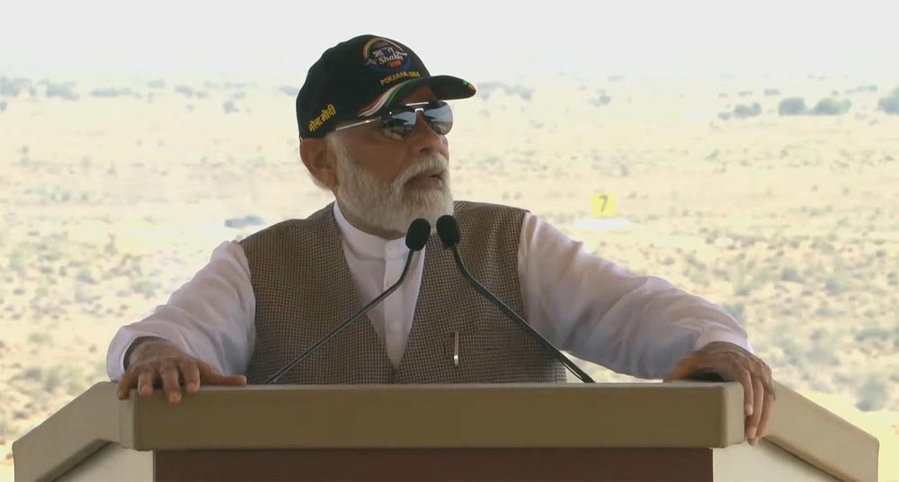 मोदी ने कहा, "आज हमारा पोखरण एक बार फिर भारत की आत्मनिर्भरता, भारत के आत्मविश्वास और भारत के आत्मगौरव की त्रिवेणी का साक्षी बना है। यही पोखरण है, जो भारत की परमाणु शक्ति का साक्षी रहा है और यहीं पर हम आज स्वदेशीकरण से सशक्तिकरण का दम भी देख रहे हैं।