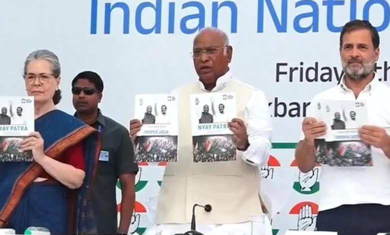 कांग्रेस आगामी शुक्रवार को लोकसभा चुनाव के लिए अपना घोषणापत्र जारी कर दिया। कांग्रेस ने अपने घोषणापत्र पांच ‘न्याय’ और 25 ‘गारंटी’ का वादा किया है। कांग्रेस नेता सोनिया गांधी, पार्टी अध्यक्ष मल्लिकार्जुन खरगे और पूर्व अध्यक्ष राहुल गांधी समेत कांग्रेस नेताओं की मौजूदगी में कांग्रेस मुख्यालय में घोषणापत्र जारी किया गया। कांग्रेस के अनुसार, घोषणापत्र में पार्टी के पांच न्याय – ‘हिस्सेदारी न्याय’, ‘किसान न्याय’, ‘नारी न्याय’, ‘श्रमिक न्याय’ और ‘युवा न्याय’- को शामिल किया गया है।