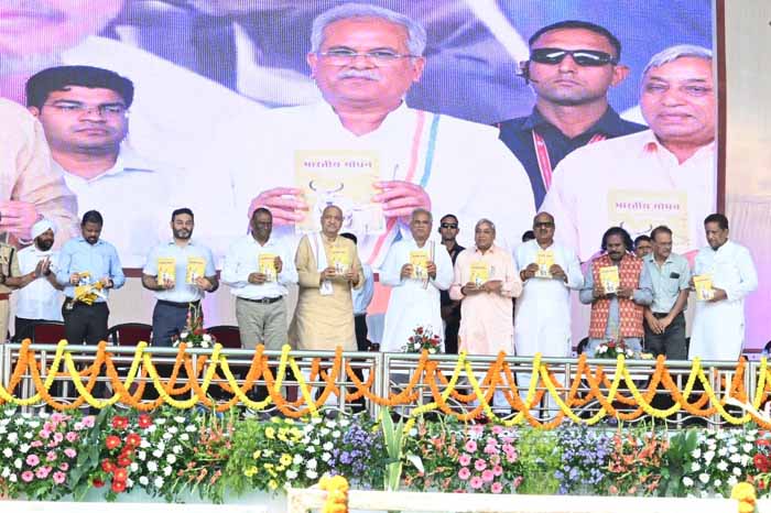 साइंस कॉलेज मैदान में आयोजित आभार सम्मेलन में मुख्यमंत्री श्री भूपेश बघेल ने पदम् विभूषण पं. झाबरमल शर्मा द्वारा भारतीय गोधन पर लिखित पुस्तक का विमोचन किया। भारतीय गोधन पर रचित यह पुस्तक 100 वर्ष पहले रची गई थी, जिसमें गोवंश पशुओं की सुरक्षा और गोधन के बारे में विस्तार से समझाया गया है।