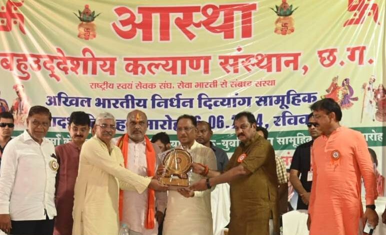 मुख्यमंत्री श्री विष्णु देव साय ने कहा कि आस्था बहुउद्देशीय कल्याण संस्थान का यह आयोजन पुण्य का कार्य है। संस्था लगातार जनकल्याण का कार्य कर रही है। चाहे वह लावारिश लाशों को सद्गति देेने का कार्य हो, रक्तदान कार्य हो या दिव्यांगजनों का वैवाहिक कार्यक्रम हो। संस्था से जुड़े सभी पदाधिकारी पुण्य के कार्य में सहभागी हैं। मुख्यमंत्री श्री साय ने कहा कि शारीरिक रूप से विकृत लोगों को पहले विकलांग के नाम से जाना जाता था, जिसे देश के प्रधानमंत्री श्री नरेन्द्र मोदी जी ने सम्मान-जनक नाम दिव्यांग दिया है। उन्होंने कहा कि राज्य सरकार दिव्यांगजनों के लिए विभिन्न योजनाएं संचालित कर हर संभव सहयोग का प्रयास कर रही है। उन्होंने आदर्श विवाह में सम्मिलित होने पहुंचे हुए नवदम्पत्तियों के परिजनों को भी बधाई एवं शुभकामनाएं दी। इस अवसर पर मुख्यमंत्री ने अपने करकमलों से आस्था बहुउद्देशीय कल्याण संस्थान के विकास में उल्लेखनीय योगदान करने वालों को स्मृति चिन्ह भेंट कर सम्मानित किया।