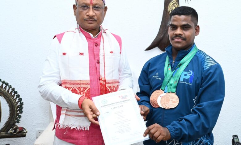 मुख्यमंत्री श्री साय से एशियन मेन्स इक्विप्ड पावरलिफ्टिंग चैंपियनशिप के पदक विजेता खिलाड़ी श्री जे. भागवत राव ने की सौजन्य मुलाकात