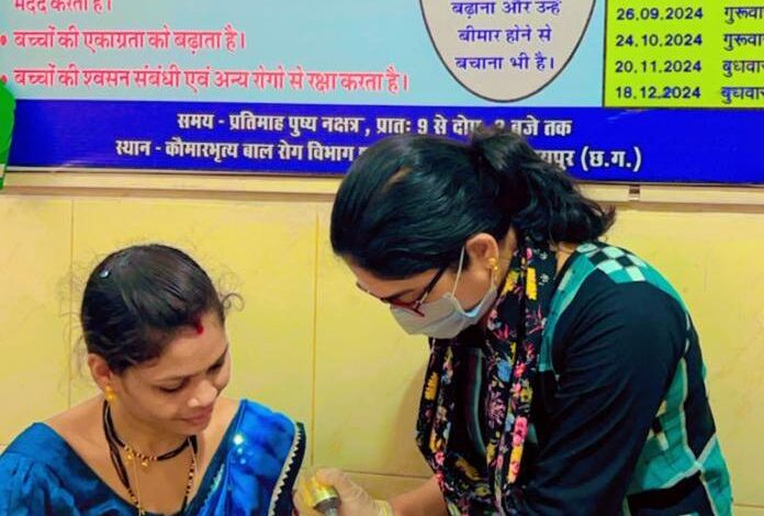 रायपुर. 8 जुलाई 2024. बच्चों के व्याधिक्षमत्व, पाचन शक्ति, स्मरण शक्ति, शारीरिक शक्ति वर्धन एवं रोगों से बचाव के लिए शासकीय आयुर्वेद महाविद्यालय चिकित्सालय रायपुर में आज 1342 बच्चों को स्वर्णप्राशन कराया गया। आयुर्वेद महाविद्यालय चिकित्सालय के कौमारभृत्य विभाग द्वारा हर पुष्य नक्षत्र तिथि में शून्य से 16 वर्ष के बच्चों को स्वर्णप्राशन कराया जाता है। स्वर्णप्राशन के साथ ही डॉ. लवकेश चंद्रवंशी ने बच्चों के स्वास्थ्य का परीक्षण भी किया।