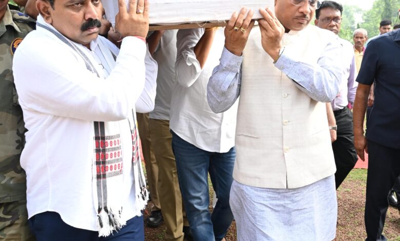 रायपुर, 19 जुलाई 2024- मुख्यमंत्री श्री विष्णु देव साय और उपमुख्यमंत्री श्री विजय शर्मा ने आज चौथी बटालियन माना पहुंचकर गत दिवस बीजापुर जिले के तर्रेम में माओवादियों द्वारा किये आईईडी ब्लास्ट में शहीद हुए जवान श्री भरत लाल साहू के पार्थिव शरीर पर पुष्पचक्र अर्पित कर श्रद्धांजलि दी। मुख्यमंत्री और उपमुख्यमंत्री ने शहीद जवान के पार्थिव शरीर को कंधा देकर ससम्मान निवास रायपुर के सड्डू के लिए रवाना किया।