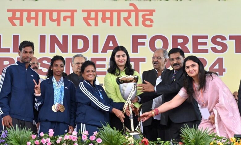 रायपुर 20 अक्टूबर 2024/ अखिल भारतीय वन खेलकूद प्रतियोगिता में छत्तीसगढ़ ने पहला स्थान प्राप्त कर ओवरऑल चैम्पियन बना। समापन समारोह में विधानसभा अध्यक्ष डॉ. रमन सिंह ने विजेता खिलाड़ियों को ट्रॉफी प्रदान की। इस मौके पर राज्यपाल श्री रमेन डेका ने अपने वीडियो संदेश में खिलाड़ियों को बधाई और शुभकामनाएं दी। कार्यक्रम में सांसद श्री बृजमोहन अग्रवाल, विधायक सर्वश्री राजेश मूणत, पुरन्दर मिश्रा विशेष रूप से उपस्थित थे।