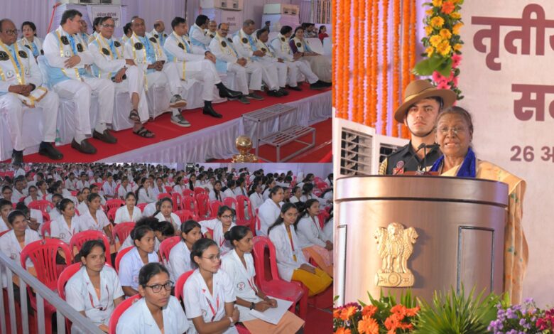 राष्ट्रपति ने कहा कि जनजाति समाज में सिकल सेल एनीमिया की अभी भी समस्या है। भारत सरकार सिकल सेल एनीमिया उन्मूलन के लिए प्रयासरत है। उन्होंने कहा कि स्वास्थ्य कर्मी ही अग्रिम पंक्ति में होते हैं। आप सामान्य लोगों को स्वास्थ्य समस्याओं के बारे में जागरूक बना सकते हैं, आम नागरिकों को सरकार द्वारा किए जा रहे हैं प्रयासों से अवगत करा सकते हैं। आप नीति निर्माता और सम्माननीय जनता के बीच सेतु का कार्य कर सकते हैं। उन्होंने विद्यार्थियों से कहा कि आप लोगोें के ग्रामीण क्षेत्रों में जाने से देश की बहुत बड़ी जनसंख्या की वास्तविक समस्याओं से अवगत हो पाएंगे। मैं चाहती हूं कि सभी विद्यार्थियों को समय-समय पर गांव के सामुदायिक स्वास्थ्य केंद्रों में पदस्थ करना चाहिए।