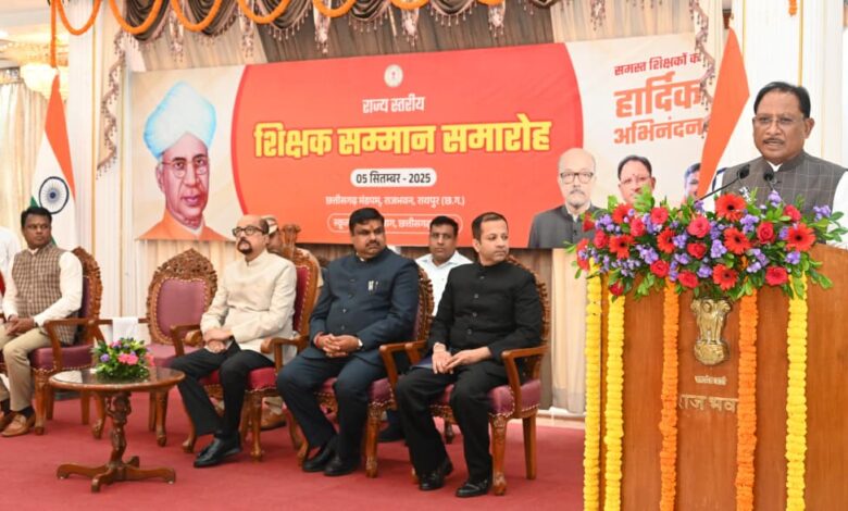 समारोह की अध्यक्षता कर रहे मुख्यमंत्री श्री विष्णु देव साय ने कहा कि शिक्षक ही सच्चे राष्ट्र निर्माता होते हैं। वे देश को ऐसे राष्ट्रभक्त नागरिक देते हैं, जो आगे चलकर समाज और राष्ट्र की उन्नति में योगदान देते हैं। जिस प्रकार दीपक स्वयं जलकर दूसरों को प्रकाश देता है, उसी प्रकार शिक्षक भी अनेक कठिनाइयों के बावजूद ज्ञान का उजाला फैलाते हैं। उन्होंने कहा कि छत्तीसगढ़ राज्य अपनी स्थापना के 25 वर्ष पूरे कर रहा है और इस रजत जयंती वर्ष में प्रदेश ने हर क्षेत्र में उल्लेखनीय प्रगति की है। शिक्षा विकास का मूलमंत्र है और इसके बिना जीवन अधूरा है। पिछले वर्षों में शिक्षा के क्षेत्र में भी व्यापक विस्तार हुआ है। आज प्रदेश में 20 से अधिक विश्वविद्यालय, 15 से ज्यादा मेडिकल कॉलेज और राष्ट्रीय ख्याति प्राप्त संस्थान जैसे आईआईटी, आईआईएम, एम्स तथा लॉ विश्वविद्यालय स्थापित हैं।