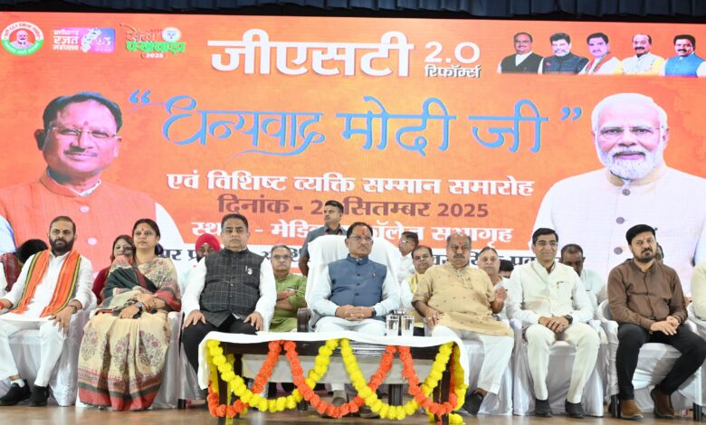 रायपुर 28 सितंबर 2025/ मुख्यमंत्री श्री विष्णुदेव साय आज राजधानी रायपुर के मेडिकल कॉलेज सभागार में आयोजित जीएसटी 2.0 रिफॉर्म्स “धन्यवाद मोदी जी” कार्यक्रम में शामिल हुए। मुख्यमंत्री श्री साय ने कहा कि जीएसटी रिफॉर्म्स से आर्थिक क्षेत्र में ऐतिहासिक बदलाव हुए हैं, जिनका सीधा लाभ आम जनता को मिल रहा है। जीएसटी दरों में कटौती से 140 करोड़ देशवासियों के जीवन में खुशी आई है।