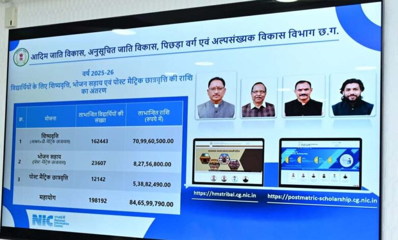 रायपुर, 10 अक्टूबर 2025/ मुख्यमंत्री श्री विष्णु देव साय की पहल पर राज्य के शैक्षणिक संस्थानों, आश्रम-छात्रावासों और तकनीकी एवं प्रोफेशनल पाठ्यक्रम में पढ़ाई करने वाले अनुसूचित जाति, जनजाति, पिछड़ा वर्ग, अल्पसंख्यक और आर्थिक रूप से कमजोर वर्ग के विद्यार्थियों को शिष्यवृत्ति एवं छात्रवृत्ति का भुगतान अब उनके बैंक खाते में ऑनलाईन किया जा रहा है। मुख्यमंत्री श्री साय ने आज मंत्रालय, महानदी भवन में आयोजित कार्यक्रम में इन वर्गों के 1.98 लाख विद्यार्थियों के बैंक खातों में 84.66 करोड़ रूपए की शिष्यवृत्ति एवं छात्रवृत्ति ऑनलाईन अंतरित की।