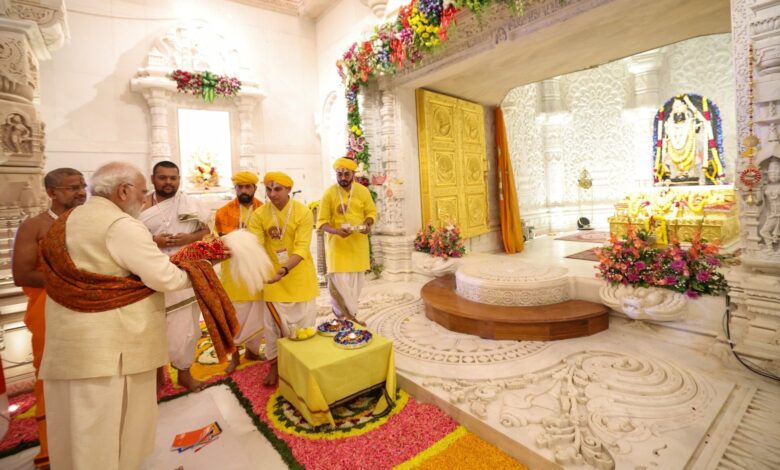 पीएम का आगमन और पूजा: पीएम मोदी दिल्ली से महर्षि वाल्मीकि एयरपोर्ट पहुंचे, और साकेत महाविद्यालय से रोड शो के माध्यम से सप्त मंदिर होते हुए राम मंदिर पहुंचे। उन्होंने गर्भगृह और प्रथम तल पर बने राम दरबार में भी पूजा-अर्चना की।