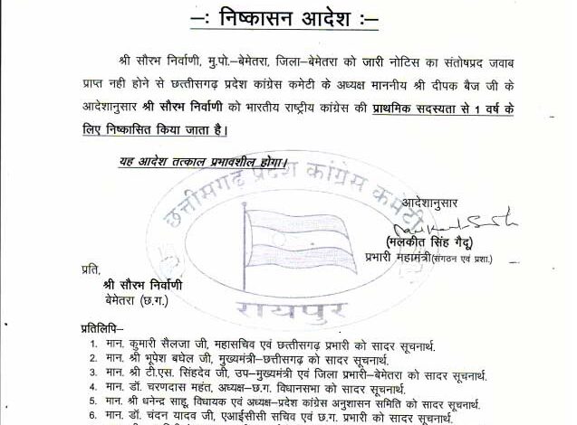 बेमेतरा के कांग्रेस नेता सौरव निवार्णी को पार्टी से एक साल के लिए निष्कासित कर दिया गया है। प्रदेश कांग्रेस महामंत्री के हवाले से जारी पत्र में कहा गया है कि पिछले दिनों पार्टी विरोधी बयान को अनुशासनहीनता मानते हुए जवाब मांगा गया था लेकिन जबाव संतोषप्रद नहीं मिलने के कारण उक्त कार्रवाई की गई है।