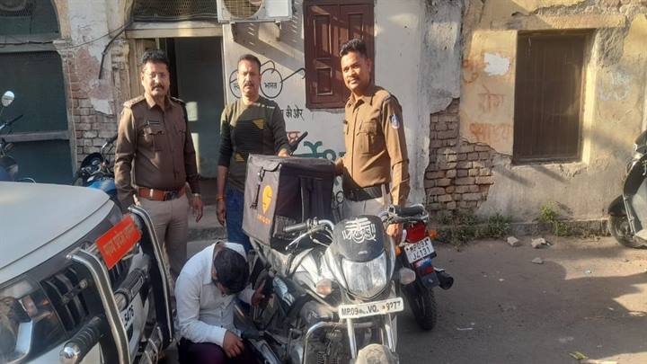 कलेक्टर डॉ. इलैयाराजा टी के आदेशानुसार एवं सहायक आबकारी आयुक्त मनीष खरे के निर्देशन में इंदौर जिले में अवैध मदिरा के विरूद्ध प्रभावी कार्यवाही की जा रही है। इसी सिलसिले में आबकारी कंट्रोल रूम प्रभारी एवं सहायक जिला आबकारी अधिकारी राजीव मुदगल के मार्गदर्शन में रविवार को वृत प्रभारी राकेशसिंह मण्डलोई के नेतृत्व में टीम गठित कर मुखबिर की सूचना के आधार महावीर नगर मैन रोड़ पर एक मोटरसाइकिल को रोका गया।आबकारी दल को देखकर मोटरसाइकिल चालक ने भागने का प्रयास किया, लेकिन स्टॉफ की सजगता व तत्परता के कारण मोटरसाइकिल चालक मयूर पिता दिनेश साल्वी को पकड़ लिया गया। तलाशी लेने पर मोटरसाइकिल चालक से स्वीगी के डिलीवरी बैग में विदेशी मदिरा की कुल 12 बोतल कुल 9 बल्क लीटर मदिरा बरामद हुई। मौके से आरोपी को गिरफ्तार कर म.प्र. आबकारी अधिनियम की धारा 34(1) क का प्रकरण पंजीबद्ध किया गया। अवैध मदिरा के संग्रह , परिवहन व विक्रय के विरुद्ध कार्यवाही निरंतर जारी रहेगी।