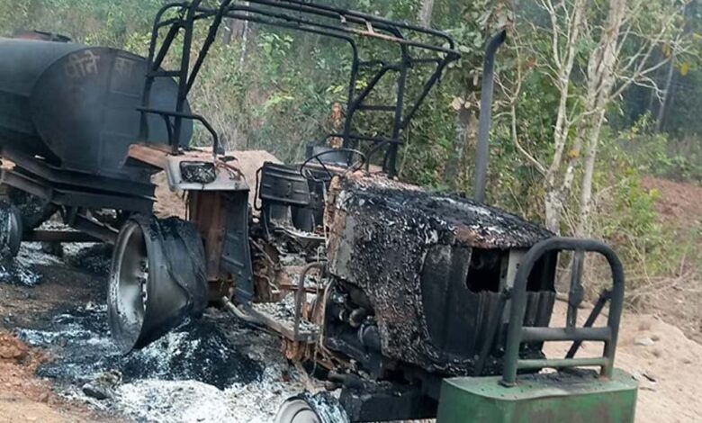 पुल निर्माण कार्य में टैंकर, मशीन और ट्रैक्टर वाहनों को नक्सलियों ने किया आग के हवाले