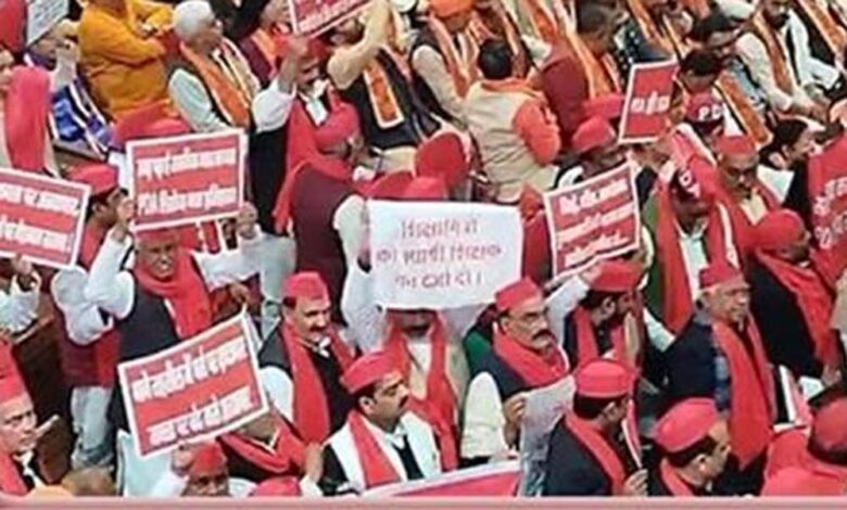 उत्तर प्रदेश विधानसभा के बजट सत्र के पहले दिन विधान भवन परिसर में सपा सरकार की नीतियों के खिलाफ जमकर नारेबाजी की
